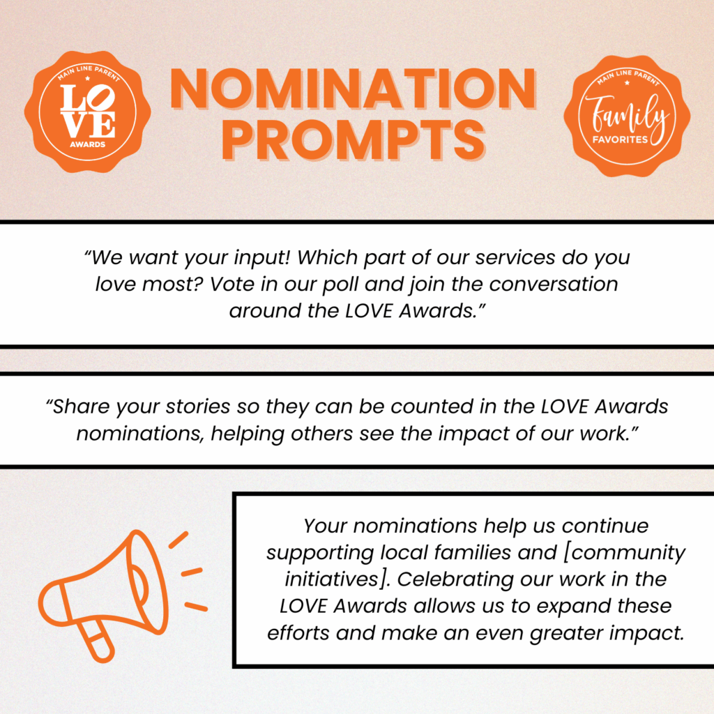 The Main Line Parent LOVE Award Winners and Family Favorite Honorees are selected based on trusted recommendations from our friends and neighbors in the Main Line Parent Community. Since 2015, we’ve encouraged local parents to nominate the resources they know and trust, recognizing those who provide outstanding service and dedication to families.