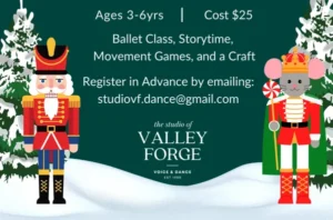 The Studio of Valley Forge will host a Nutcracker party for the preschool set this December. Dancers may come dressed as their favorite prince or princess to enjoy a party filled with movement games, songs, a ballet class, story time, and a craft! Each event is open to all preschoolers […]