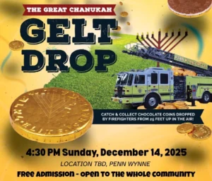 Chabad of Penn Wynne and the Penn Wynne Fire Company invite all to the Great Chanukah Gelt Drop. Join the community to light the Menorah, enjoy latkes and donuts, Chanukah crafts and more. With the help of local firefighters, catch Chocolate Chanukah coins that will parachute down from the top […]