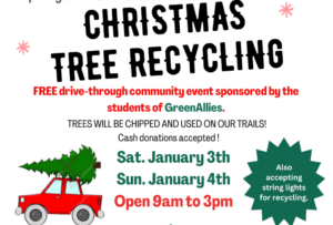 Althouse Arboretum makes Christmas tree-cycling easy at their annual, free drive-through Christmas Tree Recycling event. Just drive in with your Christmas tree and students will remove it from your car. Later in the year, arboretum volunteers use the collected trees to make wood chips for the trails. There is no […]
