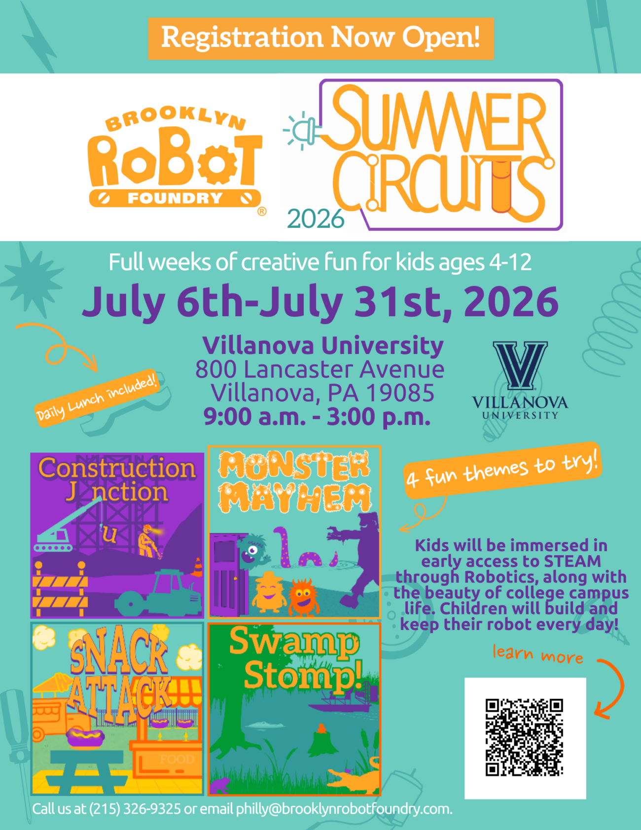 Looking for a unique and exciting summer camp? Join the Brooklyn Robot Foundry Summer Circuit Camp at Villanova University! From July 6th – July 31st, 2026, kids will build, tinker, play, and take home a new robot every day!