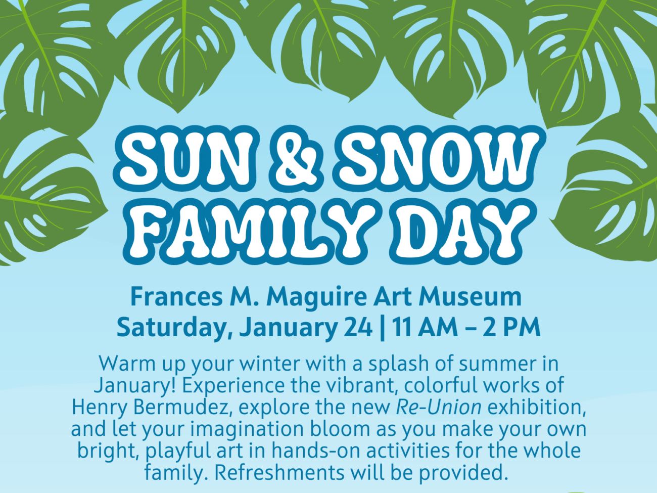 Join Sun & Snow Family Day at the Maguire Art Museum, and experience the vibrant, colorful works of Henry Bermudez, explore the “Re-Union” exhibition, and let your imagination bloom as you make your own bright, playful art in hands-on activities