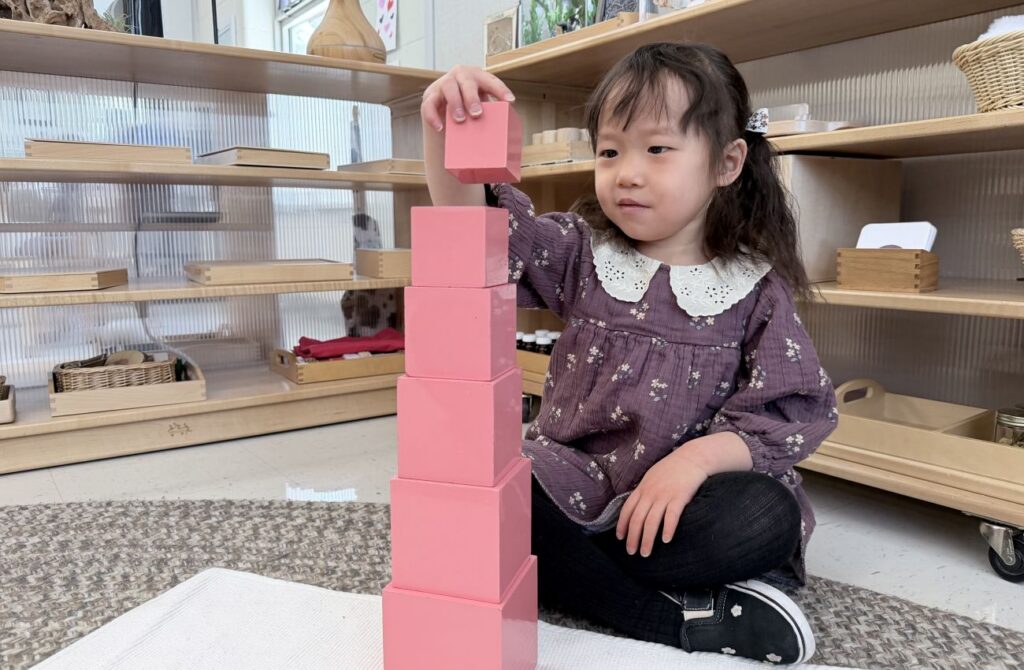 One of the most iconic Montessori materials your child will encounter is the Pink Tower—ten graduated pink cubes that stack from largest to smallest. As children like Luna carefully build this tower, they’re not just playing—they’re developing visual discrimination, spatial awareness, hand-eye coordination, and the focused concentration that will serve them throughout their academic career.