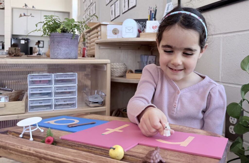 Materials like the Sandpaper Letters come alive during this year. As children like Isabel trace the textured letters with their fingers, they’re building muscle memory for writing while connecting sounds to symbols—a multisensory approach that makes literacy feel natural rather than forced. The work grows more sophisticated as children match objects to letters, building the phonetic foundation they’ll need for reading and writing.